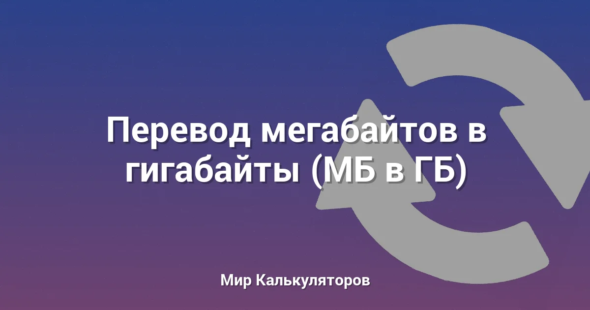 Этот онлайн конвертер поможет вам мгновенно перевести объем данных из мегабайтов (МБ) в гигабайты (ГБ).