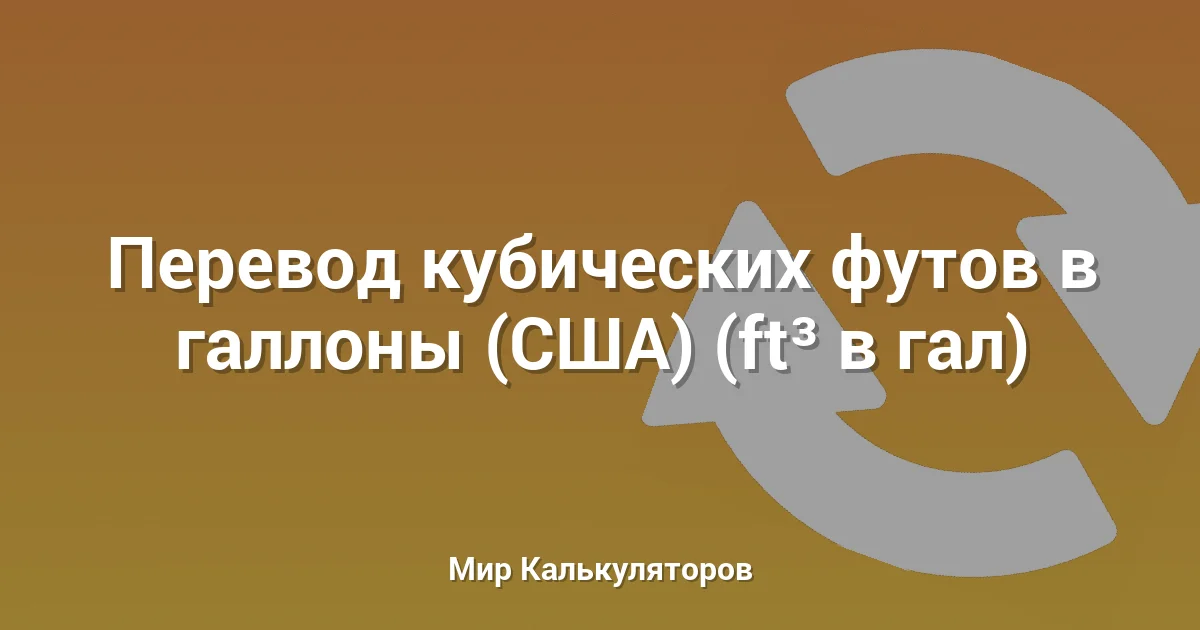 Конвертер позволяет быстро перевести значение из кубических футов (ft³) в галлоны (США) (гал).