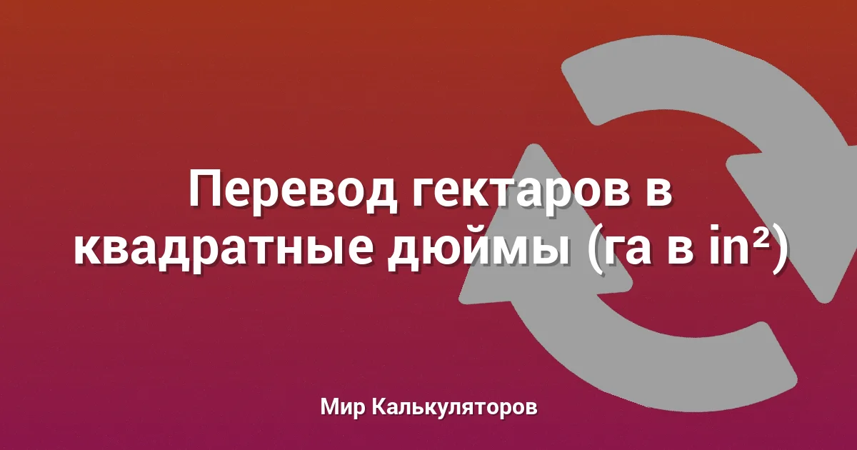 Используйте этот калькулятор для конвертации площади из гектаров (га) в квадратные дюймы (in²).
