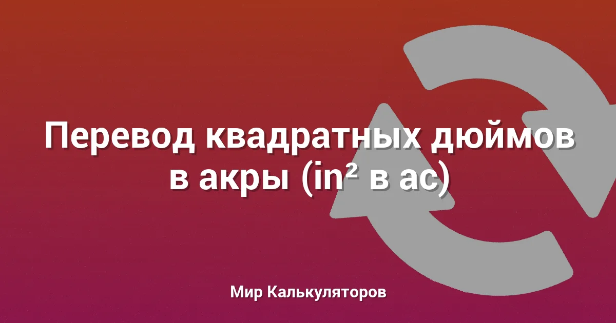 Используйте этот калькулятор для конвертации площади из квадратных дюймов (in²) в акры (ac).