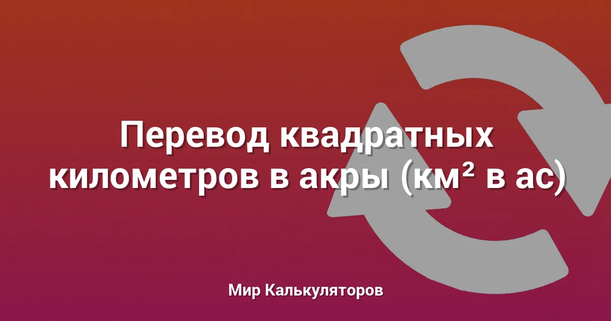 Используйте этот калькулятор для конвертации площади из квадратных километров (км²) в акры (ac).