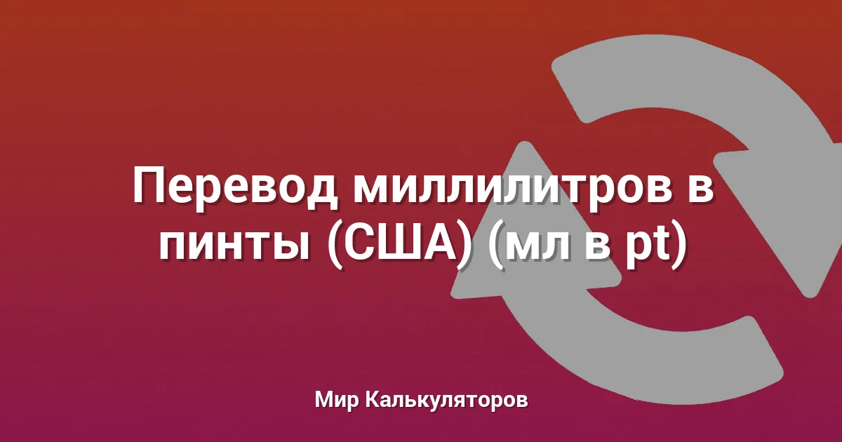 Конвертер для перевода объема из миллилитров (мл) в пинты (США) (pt). Полезен в кулинарии, автомобильном деле и науке.
