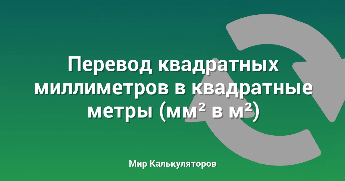 Используйте этот калькулятор для конвертации площади из квадратных миллиметров (мм²) в квадратные метры (м²).