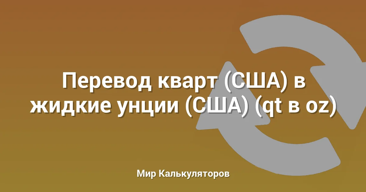 Конвертер для перевода объема из кварт (США) (qt) в жидкие унции (США) (oz). Полезен в кулинарии, автомобильном деле и науке.
